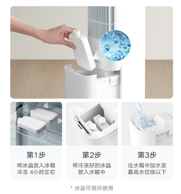 冷风模式下,搭配米家冰晶使用可以增强制冷效果快速降温(需提前放入冰箱冷冻4小时左右)。