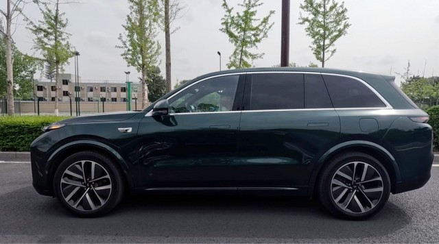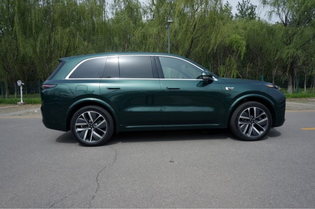 来到车侧,理想L8的车身线条非常流畅且柔和,这么大的车身尺寸也没有显得笨重。而车顶部分在C柱往后也没有过分向下收,仅仅有一个比较平滑的倾斜角度,从而保证了车内第三排的头部空间。