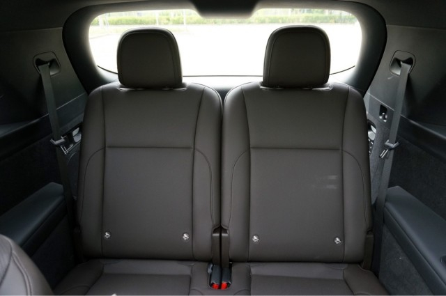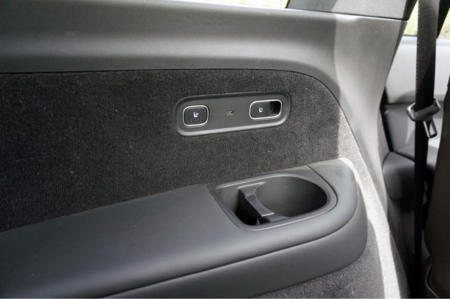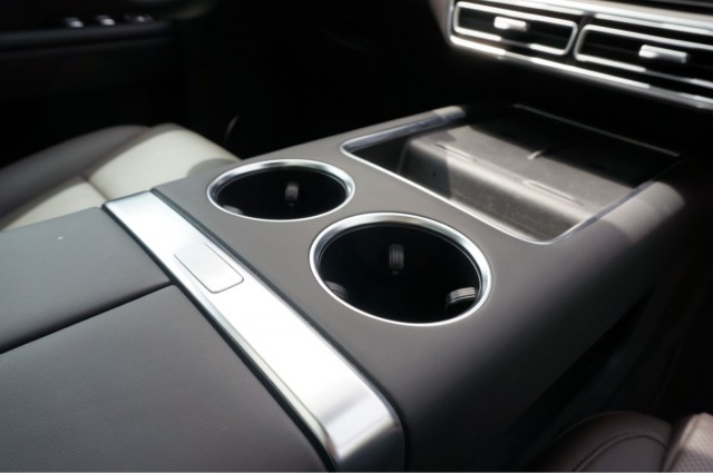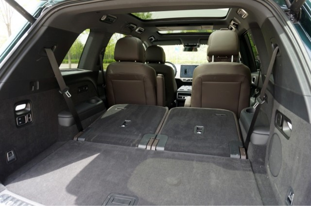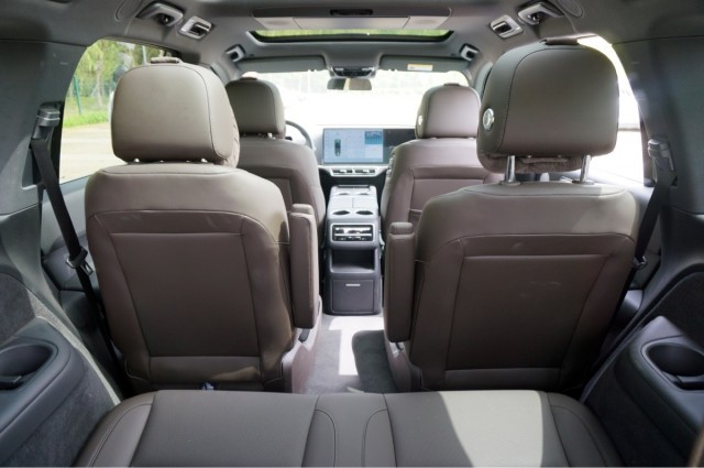 通过二排两个座椅中间的空隙,我们可以进入到车内的第三排,将二排座椅调整到一个比较适中的位置,第三排还是可以获得一个不错的头部和腿部空间,乘坐175cm左右的成年人是完全没有问题的。而且第三排也并不是摆设,是真的为舒适的乘坐做了考虑的,两个座椅都单独配备有杯架,Type-C充电接口,并支持座椅加热,以及调整靠背角度,下方还有一个220V电源接口。