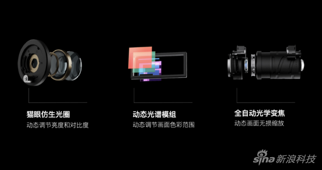 第二项技术是Eagle-Eye鹰眼硬件级计算光学。该技术依托于猫眼仿生光圈、动态光谱模组、全自动光学变焦模组三大硬件,智能调节画面亮度、色彩和对比度。