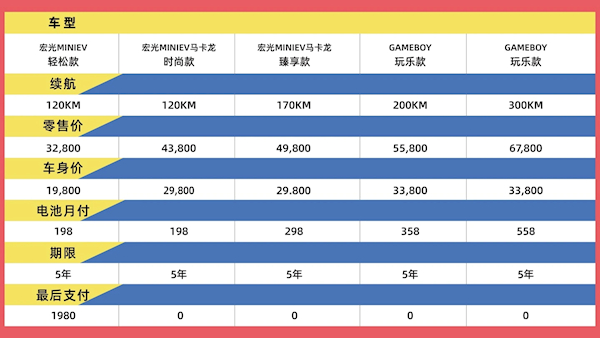 其中,车身价最低的为宏光MINI EV轻松款仅1.98万元,电池月付198元;而最贵的为GAMEBOY玩乐款的3.38万元,电池月付558元,两者的电池月付期限均为5年。