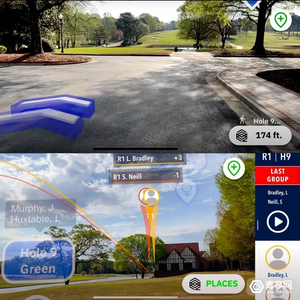 AR体育方案商Quintar也与谷歌就AR展开合作,将ARCore Geospatial API、StreetView与Quintar的Q.reality平台结合,打造交互式AR解决方案,并在PGA巡回赛的官方App中引入AR导航功能:Quintar Places,允许观众用摄像头对准现实场景查看视觉方向指示,并对比自己和目的地相差的距离,宣称精准度足够好(误差在几厘米以内)。