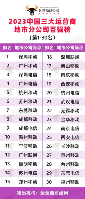 据运营商财经网透露,近期内将正式发布“2023三大运营商地市分公司百强榜”,而目前暂时公布营收规模排名前30名的地市分公司名单,其余名单后续还将公布。