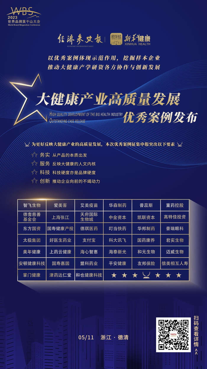 “健康中国”战略全面推进的大背景下,大健康产业已步入快车道,相关市场主体的高质量发展经验和模式亟待深入研究和总结。今年4月以来,经济参考报社、新华健康信息服务平台、新华社研究院中国企业发展研究中心联合开展“大健康产业高质量发展优秀案例”征集和系列调研活动,以优秀案例体现示范作用,推动大健康产、学、研协作与发展。在第七个“中国品牌日”到来之际,5月11日,由经济参考报社主办的“2023世界品牌莫干山大会系列活动——新华健康产业与资本高峰论坛”在浙江德清举行。论坛期间,“大健康产业高质量发展优秀案例”发布,39家企业机构入选。