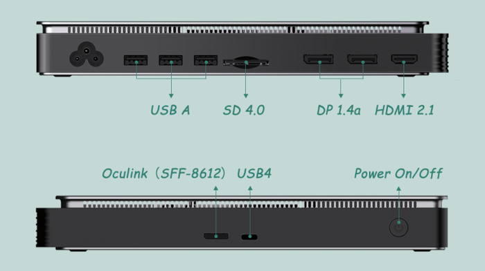 同步亮相的还有全新的GPD G1显卡坞,尺寸为225×111×29.8mm,除外接显卡外还提供扩展坞功能,提供3个USB Type A 3.2,一个SD 4.0读卡器,2个DP 1.4,a1个HDMI 2.1,背面则提供1个用于互联的Oculink(SFF-8612)母口,以及一个1个USB4接口。