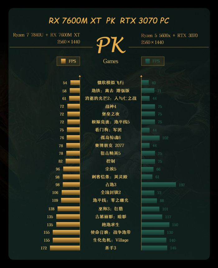 GPDG1内置AMD最新Radeon RX 7600M XT显示核心,全新RDNA 3架构,8GB GDDR6显存,2048个着色器单元,32MB无限缓存,基础频率1500MHz,游戏频率2300MHz,加速频率2615MHz,整卡功耗为75~120W。根据GPD官方公布的数据来看,理论性能超越RTX 4060移动版,游戏性能看齐RTX 3070桌面版。