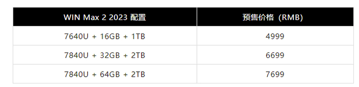 全新的GPD WIN Max 2 2023处理器方面可选锐龙5 7640U和锐龙7 7840U处理器,均采用Zen 4架构CPU+RDNA 3架构核显的设计。锐龙5 7640U版本可选16GB LPDDR5X内存和1TB SSD,而锐龙7 7840U则最高可选64GB LPDDR5X内存和2TB SSD。