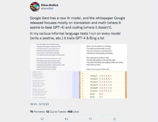 不过,宾夕法尼亚大学沃顿商学院教授莫里克(Ethan Mollick)在对 PaLM2 和 GPT-4 进行横向对比评估后认为,谷歌的模型更注重翻译与数学,但在语言测试中依然落后于 GPT-4 和必应。