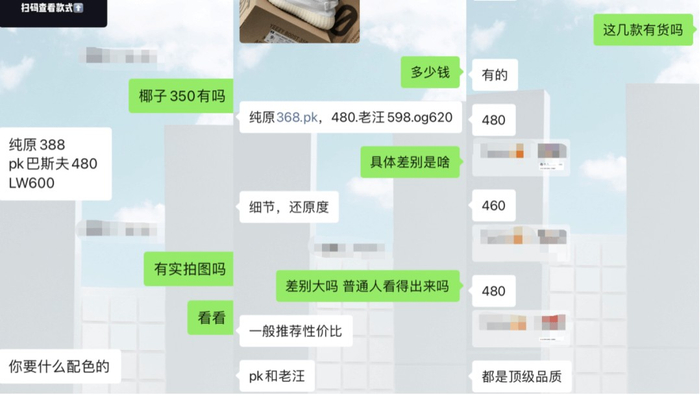 不难发现,越是在产业上游,离“源头好货”就越近,而越到下游,假鞋品质就差别越大,货源也越杂乱。因此,同样都是做假鞋商,能卖档口货的就瞧不上代发,做代发的就瞧不上食物链底层的代理。