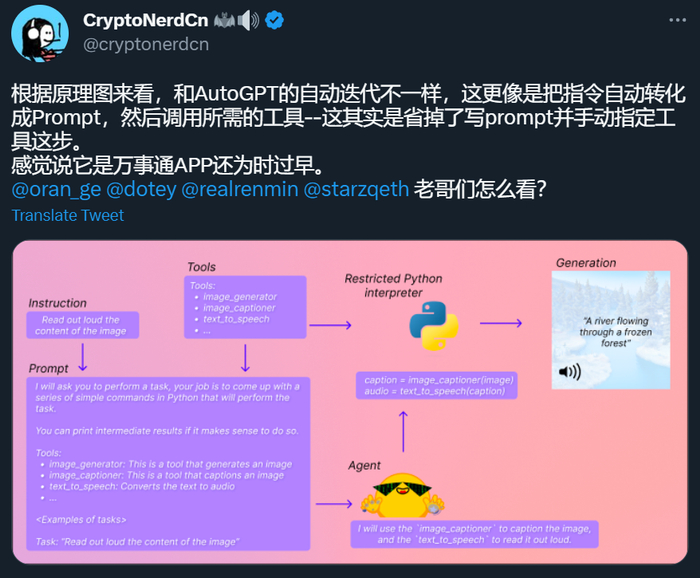 不过也有人说,这和 AutoGPT 的自动迭代还不一样,它更像是省掉了写 prompt 并手动指定工具这些步骤,距离万事通 APP 还为时过早。