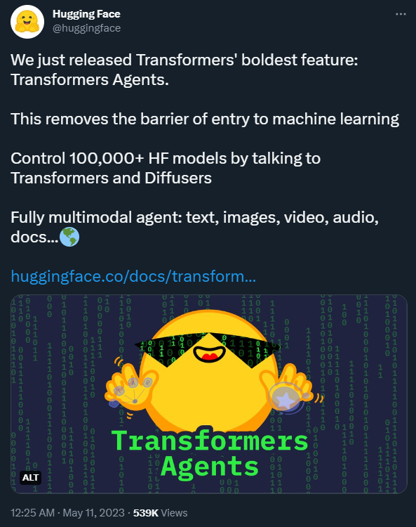 和 HuggingGPT 理念类似,他们推出了一个新的 API——HuggingFace Transformers Agents。通过 Transformers Agents,你可以控制 10 万多个 Hugging Face 模型完成各种多模态任务。