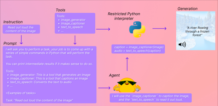简而言之,它在 transformers 之上提供了一个自然语言 API:首先定义一套策划的工具,并设计了一个智能体来解释自然语言和使用这些工具。