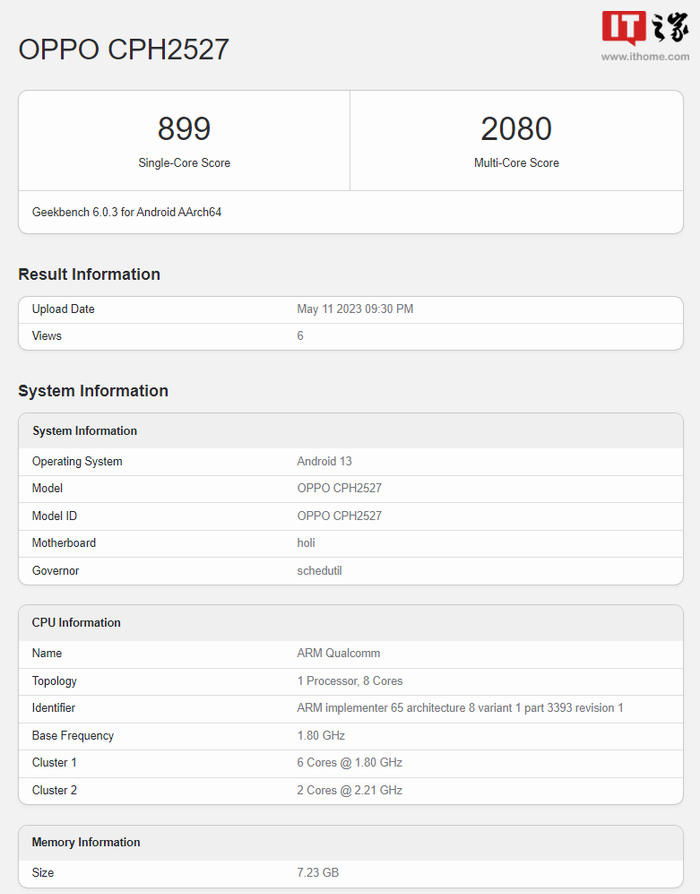 OPPO 新款智能手机型号为 CPH2527,Geekbench 6 单核测试得分 899,多核测试得分 2080,将采用代号为“holi”的八核处理器,预计是骁龙 695 SoC(IT之家注:CPU 最大频率 2.21GHz);还将配备 8 GB 内存,并预装运行基于 Android 13 的 ColorOS 系统。