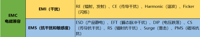 首先我们来从EMC测试项目构成说起,EMC主要包含两大项:EMI(干扰)和EMS(抗干扰和敏感度)。这两大项中又包括许多小项目,如下图:
