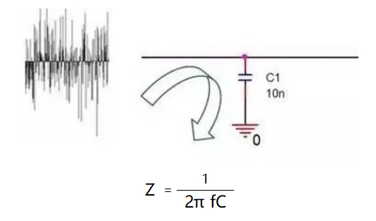 即频率f越大,电容的阻抗Z越小。当低频时,电容C由于阻抗Z比较大,有用信号可以顺利通过;当高频时,电容C由于阻抗Z已经很小了,相当于把高频噪声短路到GND上去了。
