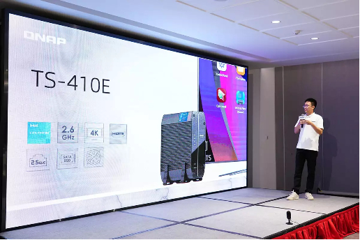 在专业玩家群体中关注度较高的 TS-410E 无风扇设计 NAS,也首次亮相现场,该机型采用双 2.5GbE 接口,支持 QTS 5.1.0 全新功能,配备坚固的强化型外壳,可安装 4 块高速 SSD。