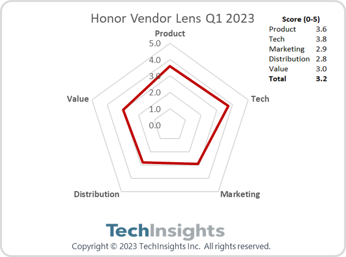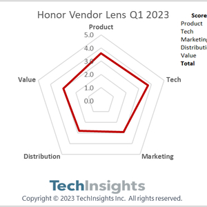 TechInsights:2023 年 Q1 荣耀智能手机全球出货量同比下降 11%,平均售价同比下降 2%