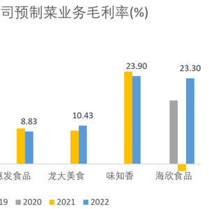 2022年,安井食品、得利斯、惠发食品(SH603536,股价6.52元,市值15.95亿元)、龙大美食(SZ002726,股价8.40元,市值90.65亿元)、味知香(SH605089,股价67.30元,市值67.30亿元)和海欣食品(SZ002702,股价5.50元,市值26.44亿元)有关预制菜业务的毛利率分别为11.42%、12.80%、8.83%、10.43%、23.90%和23.30%。