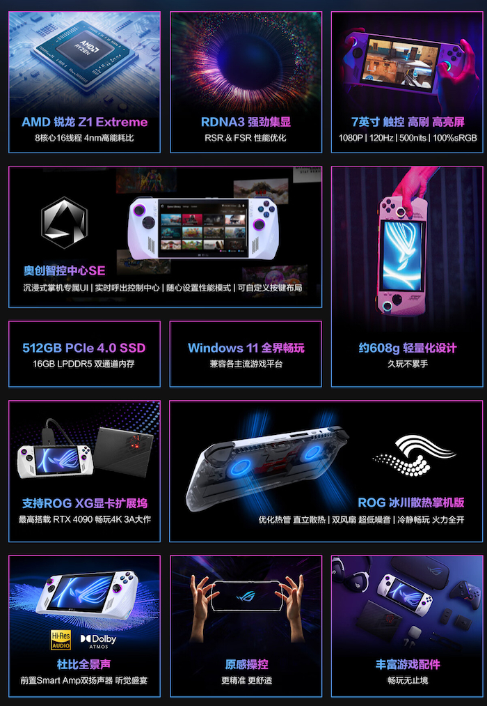 ROG Ally 掌机标配一块 1080P 全高清、120Hz 高刷新率电竞屏,运行 Windows 11 系统,重量约 608g,目前已在电商平台上架,将于 6 月 13 日开启预约。