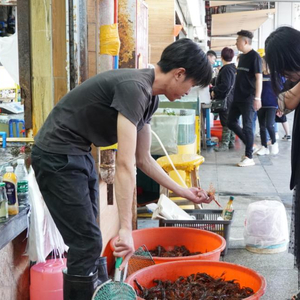 5月12日,记者来到成都市锦江区青石桥海鲜市场了解情况。中午1点左右,市场附近买菜的人流不少。入口两旁就是批发和零售海鲜的商贩们,两家店都有小龙虾在卖,鲜活的红色硬壳生物在铁盆里面不停挥舞着自己的钳子,卖小龙虾的商贩对着路过或者前来咨询龙虾价格的消费者叫卖道:“小虾12元,中虾17元,大虾25元。”