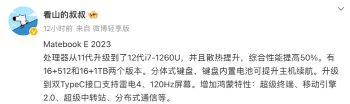 爆料当中还表示,华为MateBook E 2023不仅升级了处理器,而且散热提升,综合性能提高50%。新款有16G+512G和16G+1T两个版本;配备分体式键盘,键盘内置电池可提升主机续航;升级到双Type-C接口,支持雷电4,配备120Hz屏幕;增加鸿蒙特性:超级终端、移动引擎2.0、超级中转站、分布式通信等。