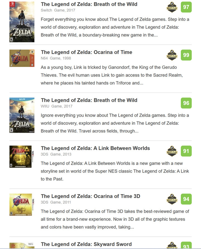 打开知名评分网站 Metacritic,你会发现除了重制,《塞尔达传说》系列的每一作都是 90 以上的高分,甚至有《时之笛》这样的 99 分、从 1998 年至今位居 M 站榜首的怪物。