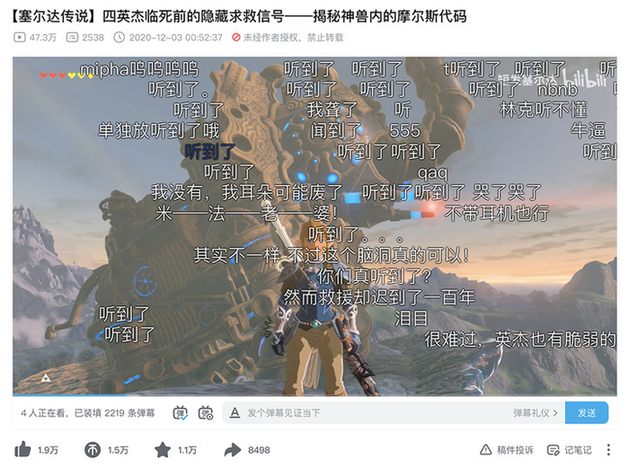 2020 年底,有玩家在《旷野之息》的神兽附近配乐中,发现了求救的摩斯电码。英杰们求救的信号,在海拉鲁大陆回荡了百年,玩家发现时,距离游戏发售已过 3 年。