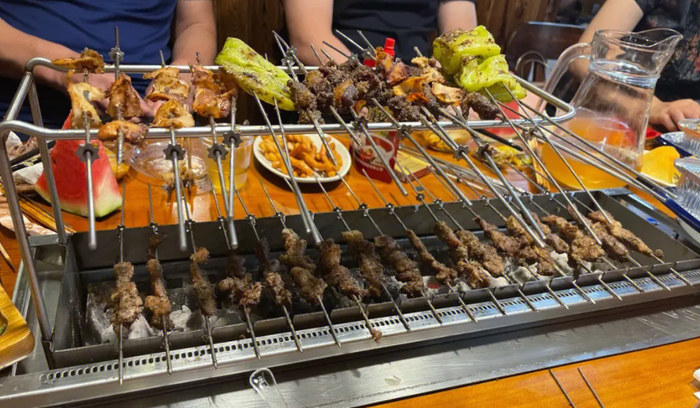 好在有本地特色的烧烤炉供应相对充足。这要归功于一位老烧烤商家,他设计了一种特殊的烤炉,其特点是两边为木炭,中间设有水槽,可以有效避免油滴落在木炭上引起烟雾。
