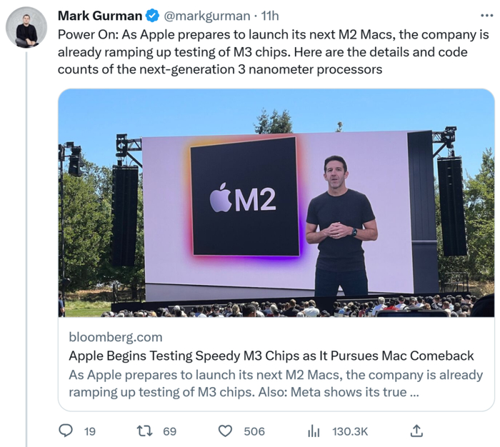 一位 Apple App Store 开发人员与 Gurman 分享了他们的内幕信息,内容涉及被认为是「明年将推出的 M3 Pro 的基础版本」,搭载于运行 macOS 14.0 的未来高端 MacBook Pro 中。需要注意的是,M3 可能会像此前几代一样出现多个变体。