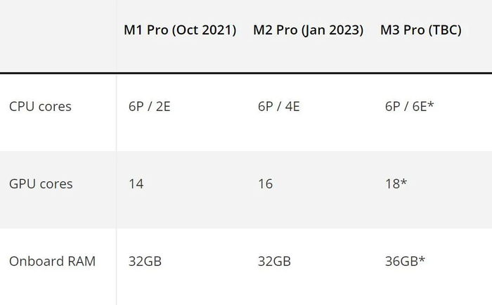 彭博社的消息来源首先关注 Apple M3 Pro,表明在 12 个 CPU 内核中,将有 6 个高性能内核(P 内核),以及 6 个节能内核(E 内核)。另外将搭配 18 个 GPU 内核和 36GB RAM。