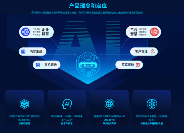 但区别于市场上现存的AI产品,麦可天然带有“外贸”的基因。“你可以理解为,麦可是一个专门为外贸企业服务的数字员工,它复用了MIC国际站在外贸领域20多年的经验积累,以及AI应用领域7年的技术沉淀,从而实现所有功能都能更加贴合外贸全链路的场景。”卢颐强调。