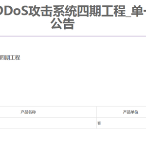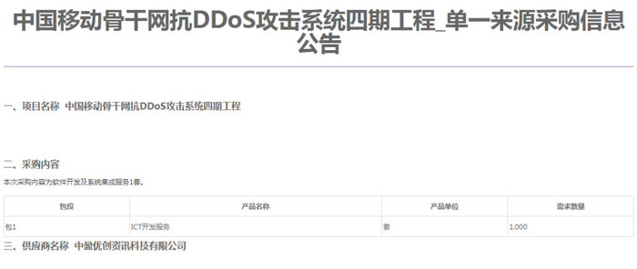 C114讯 5月15日消息(焦焦)从中国移动官网获悉,中国移动今日发布公告称,启动骨干网抗DDoS攻击系统四期工程单一来源采购,中盈优创独家中标。