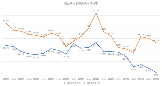 此外,服务收入占收入比例为19.51%,还略低于2022年第四季度的份额19.58%。在商品收入下滑的情况下,服务收入也出现微降。