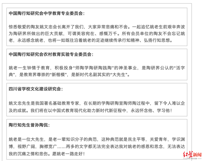 除了现场参加悼念的教育圈内外人士以外,记者了解到,中国教育科学研究院、成都市教育局、成都市教科院、成都师范学院、中国陶行知研究会、中学教育专业委员会,新疆、上海、四川、江苏、深圳等全国各地的陶行知研究会,成都东部新区文化旅游体育局教育处、成都市龙泉驿区教育科学研究院等众多教育主管部门及组织也通过不同形式向姚文忠先生表达了追思与缅怀。