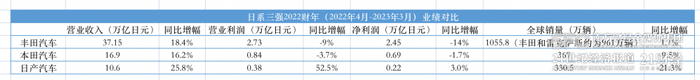 近日日系车企三强丰田汽车、本田汽车、日产汽车公布了2022财年(2022年4月1日-2023年3月31日)的业绩报告。