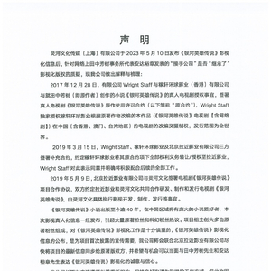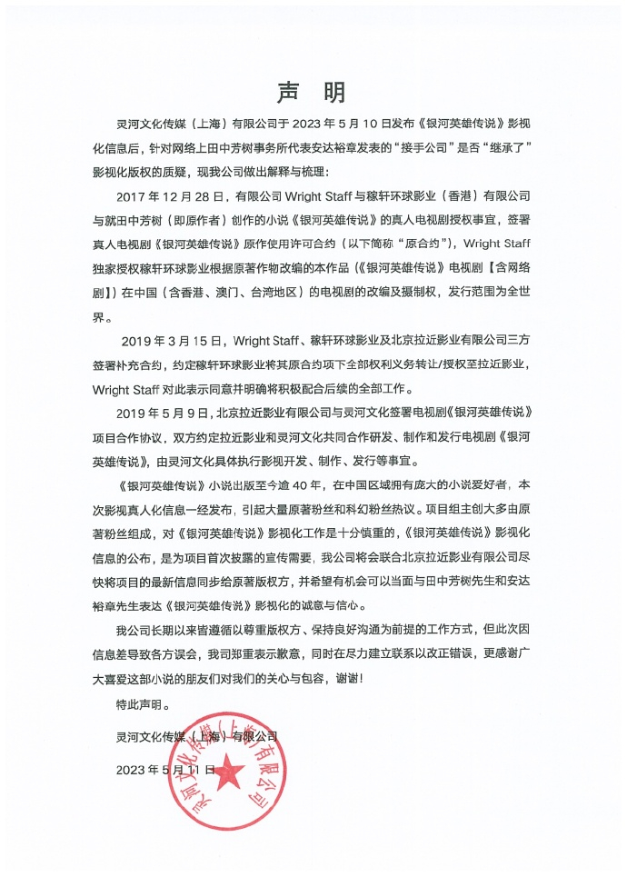 5月14日,《银河英雄传说》真人剧制作方灵河文化在微博上针对此事发布了官方声明,称影视化信息公布是为了宣传需要,将会尽快将项目最新信息同步给原著版权方,此次是因为信息差导致各方误会。
