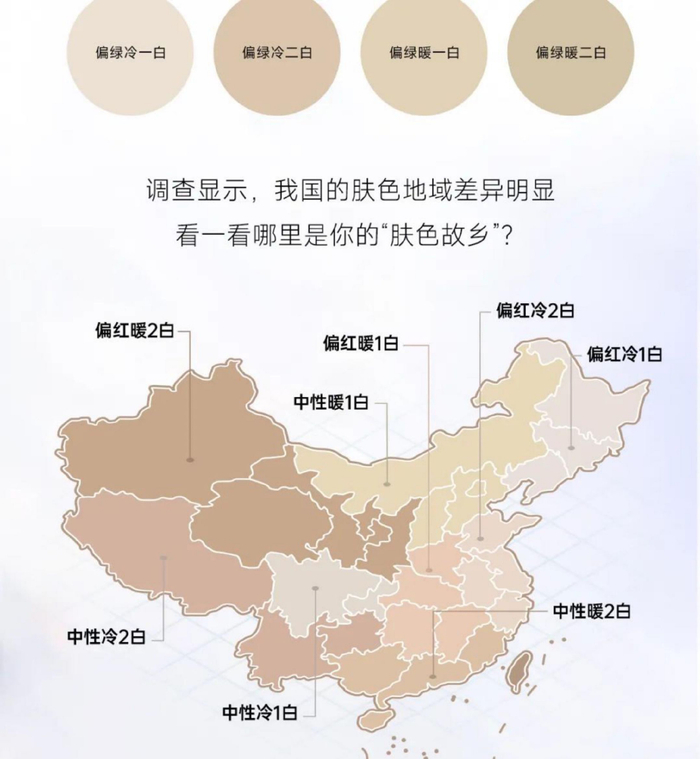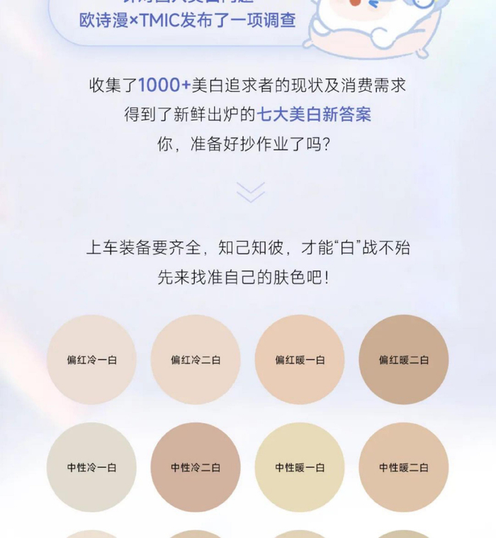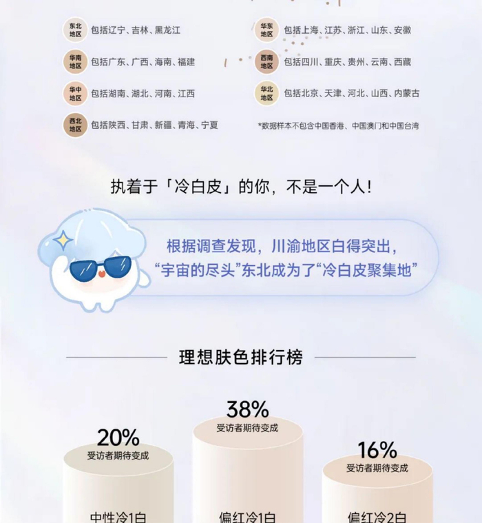 欧诗漫×TMIC千人问卷调研发现,不同区域肤色不同,但是对于“白”的追求是一致的,“冷1白”是多数消费者的“梦中情肤”。