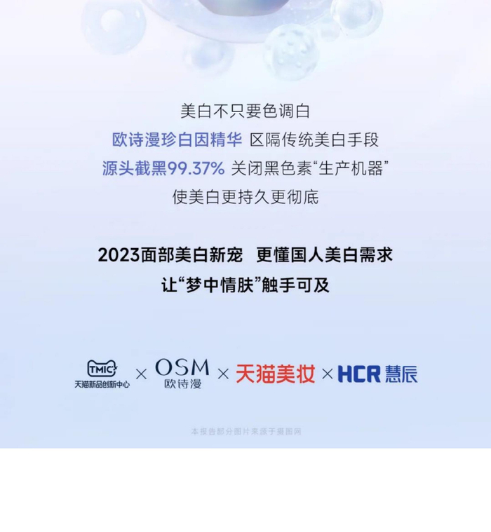 天猫美妆联合欧诗漫、TMIC以及HCR共同发布了《2023国人面部美白消费趋势白皮书》。通过消费市场和人群洞察、美白货品趋势挖掘以及国人美白未来风口展望,对美白赛道及产品进行深度挖掘,解读行业发展趋势。