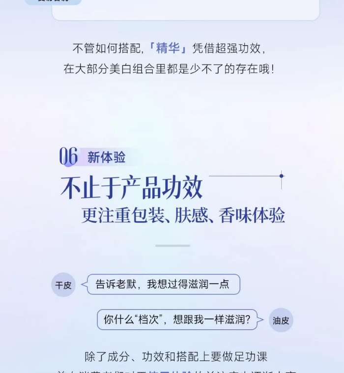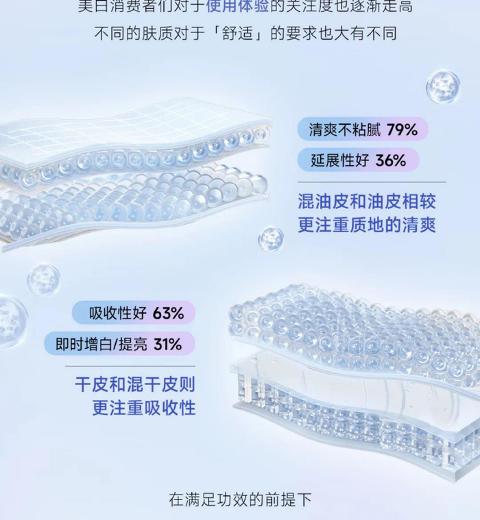 肤感享受进阶,消费者越发重视美白产品的皮肤触感体验,要求清爽不粘腻,不影响后续上妆。