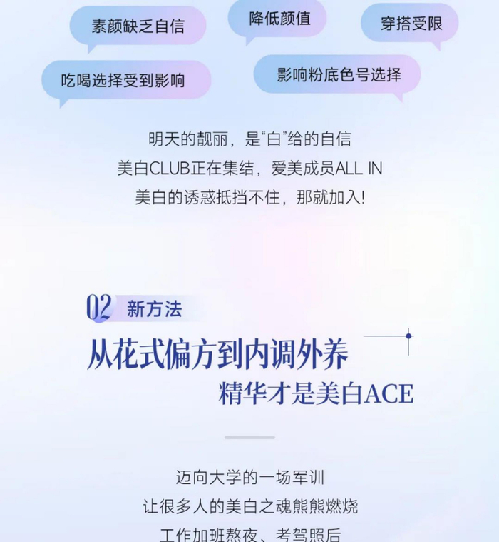 卖点细分:除沟通肌肤“不够白”问题的解决(不均、斑点、痘印等),还需聚焦肌肤改善后“透、亮、焕”的状态,尤其是强化“透亮”这一卖点。