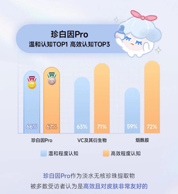 聚焦成分高效+温和度,烟酰胺、VC及其衍生物、珍白因为表现最好的三大成分。