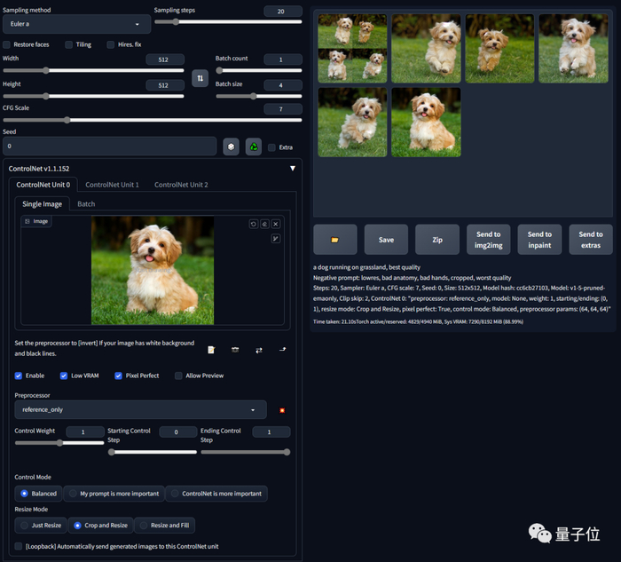 你只需要将你的 ControlNet 升级到 1.1.153 版本以上,然后选择“reference-only”作为预处理器,上传狗的图片,输入提示词“a dog running on grassland, best quality……”,SD 就只会用你的这张图作为参考进行修改了。