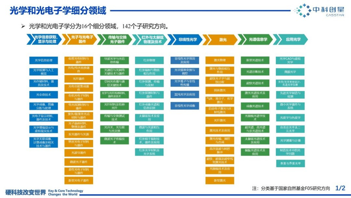 基于国家自然基金F05研究方向,光学与光电子学划分为四个层级与16个细分领域:
