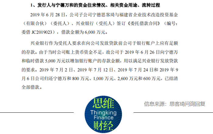 值得注意的是,思客琦当初专项借款时的账户余额都是向宁德万和拆借的。兴业银行作为受托人要求在向公司发放贷款前公司于银行账户上应有足额的存款。根据公司问询回复,由于当时公司账上货币资金不足,故思客琦于2019年6月26 日向宁德万和临时借款5000万元以增加银行账户的存款金额,用以满足兴业银行发放贷款的要求。虽然后续悉数归还了拆解资金,但拆入资金借款期间应收17.75万元,而宁德万和甚至未收取该借款利息。