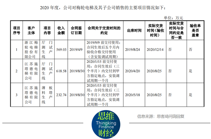 除了梅轮电梯外,思客琦对客户桑顿新能源销售的验收同样存在长时间滞后的情况,其新能源自动化生产线项目合同签订时间为2018年5月,订单涉及金额1324.14万元,而验收时间则为2020年6月。其验收情况同样跳过了2019年,直接在2020年结算。