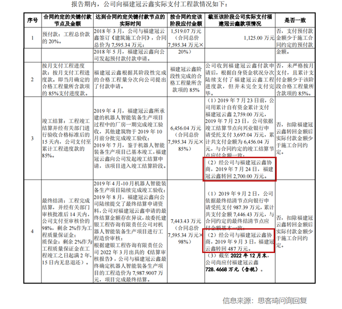 而对于是否存在将贷款挪作他用的质疑,公司回复称,截至2022年12月末公司累计支付福建冠云鑫7259.43万元,已超过专项贷款金额6000万。根据兴业银行宁德蕉城支行出具的《说明》,公司机器人智能装备生产项目的专项贷款最终流向未违反相关贷款合同的约定,不存在将贷款金额挪作他用的情形。