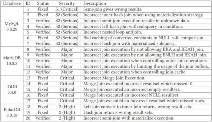 TQS 成功找到了 MySQL、MariaDB、TiDB 和 PolarDB 等数据库管理系统的一些逻辑漏洞,它们分为 20 种类型,其中 MySQL 的漏洞有 7 种、MariaDB 的有 5 种、TiDB 的有 5 种、PolarDB 的有 3 种,如下表所示。