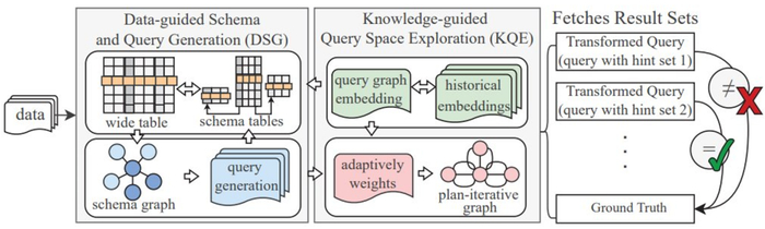 DSG 将输入数据集视为一个宽表,并且除了原始元组外,DSG 还会刻意合成一些有易错值(比如空值或非常长的字符串)的元组。针对连接查询,DSG 会为该宽表创建一个新模式,其方法是将该宽表分成多个表,确保这些表符合基于功能依赖性的范式。DSG 会将该数据库模式建模成一个图,然后在该模式图上通过随机游走来生成逻辑 / 概念查询。DSG 会将逻辑查询具体化为物理执行计划,并通过不同的提示对该查询进行变换,使 DBMS 能够执行多个不同的物理执行计划,以搜索漏洞。对于一个连接查询,其基本真值结果是通过将连接图映射回宽表而得到。