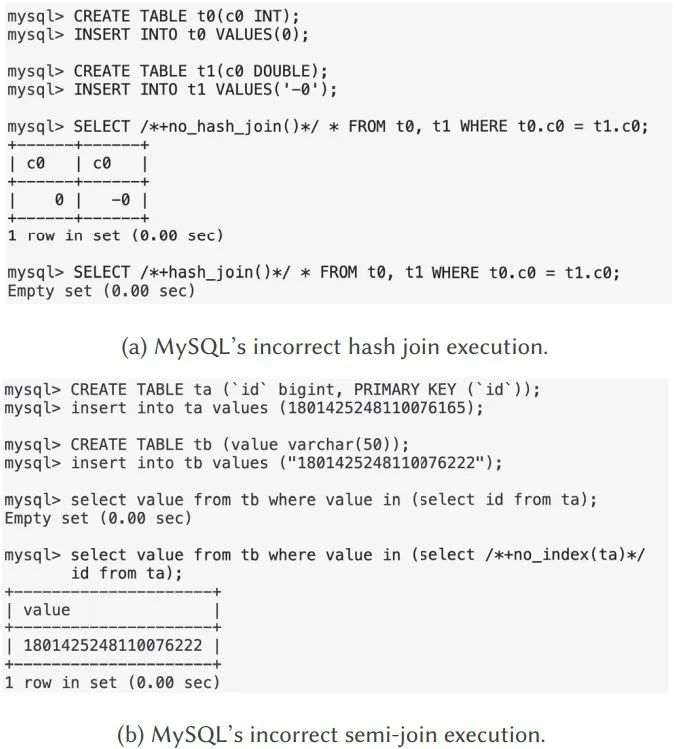图 1 (a) 展示了 MySQL 8.0.18 中的哈希连接(hash join)的一个逻辑漏洞。在这个示例中,第一个查询返回了正确的结果集,因为其执行过程中使用了块嵌套循环连接(block nested loop join)。但是,第二个查询使用内部哈希连接(inner hash join)却出了问题,返回的是一个不正确的空结果集。这是因为其底层的哈希连接算法错误地认定 0 不等于 −0。