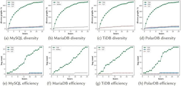 本文中,浙大的研究者提出了一种名为 Transformed Query Synthesis(TQS)的方法。在运行了 24 小时后,TQS 成功找到了 115 个漏洞,包括 MySQL 中 31 个、MariaDB 中 30 个、TiDB 中 31 个、PolarDB 中 23 个。